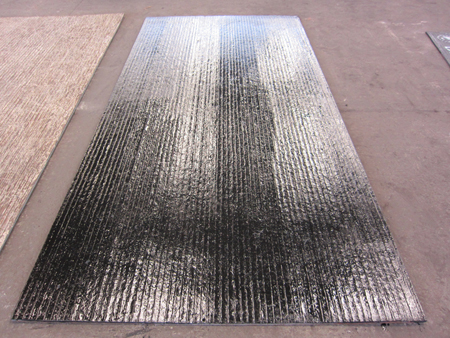 碳化鉻耐磨鋼板合金耐磨層和基體之間是冶金結合。通過專用設備,采用自動焊接工藝,將高硬度自保護合金焊絲均勻地焊接在基材上,復合層數一層至兩層以至多層,復合過程中由于合金收縮比不同,出現均勻橫向裂紋,這是耐磨鋼板的顯著特點。